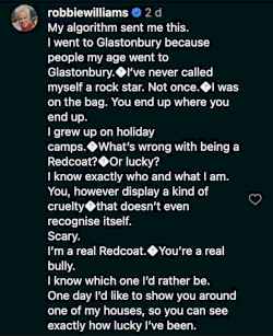 Robbie Williams hits back at “bully” podcaster: “I’m a real Redcoat. You’re a real bully. I know which one I’d rather be”