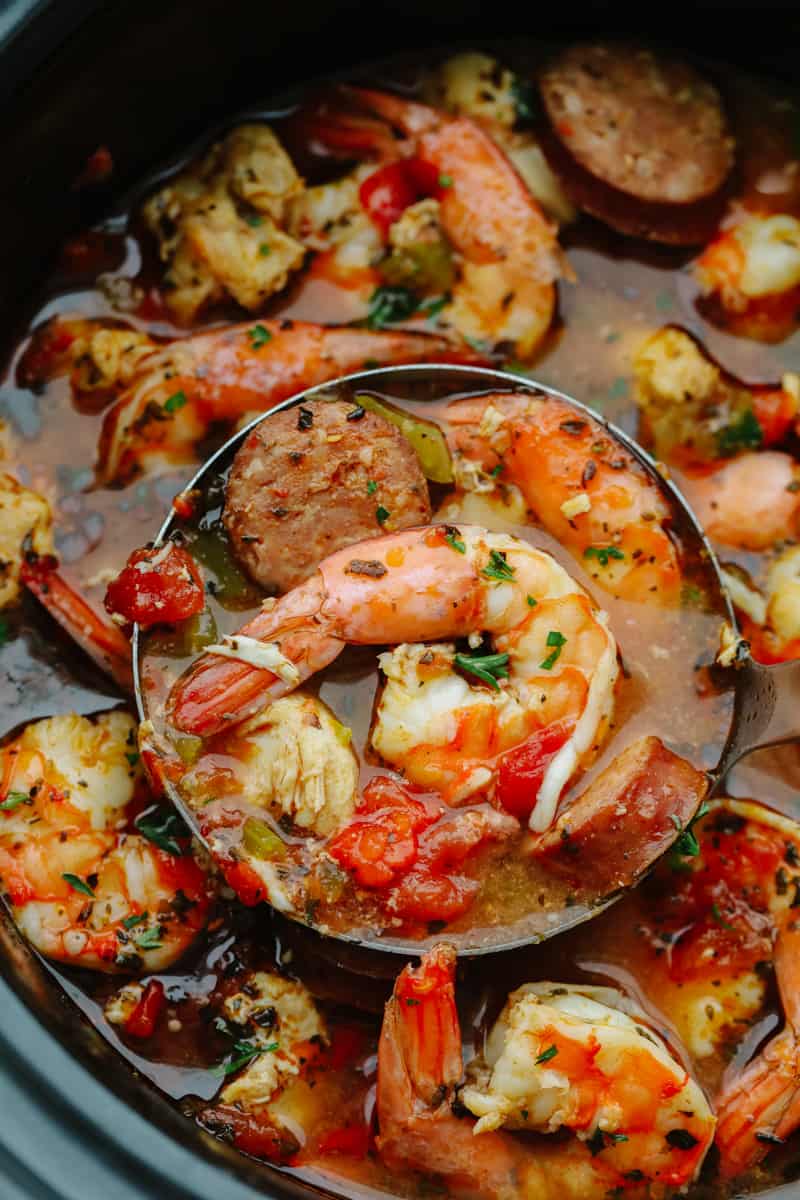 A rich, flavorful gumbo made with a dark roux, smoky andouille sausage, and tender chicken.