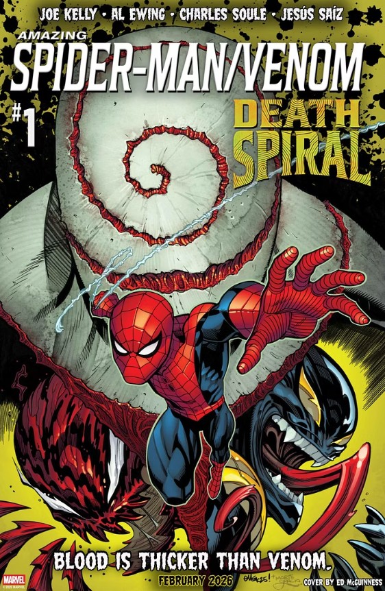 DEATH SPIRAL – PART ONE! The next epic SPIDER-MAN and VENOM crossover starts here, spinning out of THE AMAZING SPIDER-MAN, VENOM, and EDDIE BROCK: CARNAGE from February to April! A new super powered serial killer is on the loose and they’re coming for Spidey, Venom and everyone in between. But what terrible secret has CARNAGE learned and what does it have to do with Spider-Man?! Don’t miss the next chapters of this spiders and symbiotes saga in the pages of THE AMAZING SPIDER-MAN and VENOM!”