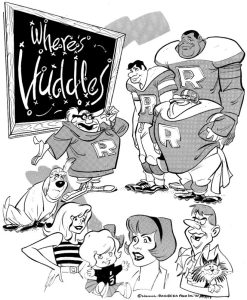 “Where’s Huddles?” was a standard family sitcom centered around a professional football quarterback for the Rhinos, Ed Huddles, and his neighbor, Bubba McCoy. Marge Huddles and Penny McCoy were their respective spouses. Mad Dog Mahoney coached the team, which also included Freight Train. Sarcastic neighbor Claude Pertwee supplied nasty comments to all. Rounding out the crew was Huddle’s baby daughter Pom-Pom, The Huddle’s requisite dog Fumbles, and Pertwee’s unfriendly cat, Beverly.