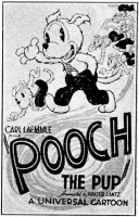 You can’t blame Walter Lantz for wanting to come up with original characters. So it makes sense that Lantz would come up with a character like Pooch the Pup. The Pooch cartoons seem to be a little bit more elaborate than the Oswalds, and more into the adventure mode that was beginning to catch on in cartoons, for such rival characters as Mickey Mouse, Flip the Frog, and even Bosko and later Buddy at Warner Brothers. We have not yet been able to figure out how the Poochs were faring against the Oswalds with exhibitors, but Lantz seemed to be putting his back into pushing the new product. Ultimately, however, Pooch did not replace Oswald as the lead character in Universal’s cartoons – probably because of his lack of outstanding personality traits. Even a redesign in 1933 didn’t help. Essentially, these cartoons could just as easily have been cast as Oswalds with some minor reworking of the animation, and nobody would have noticed the difference.