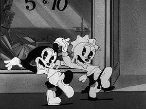 Five and Dime (9/18/33) – Oswald finds romance at the china counter of a five and dime store, ducking out of a rainstorm in a close following of the lyric to the featured song, “I Found a Million Dollar Baby (In a Five and Ten Cent Store)”. Oswald and the girl get evicted from the store for breaking a good deal of the crockery, but proceed to get hitched in a long continuous panning shot, and settle straight into their honeymoon cottage, where they anticipate a blessed event, with Doc Stork waiting on the roof (to give them the bird). The song was a 1931 pop, recorded by Waring’s Pennsylvanians for Victor, Paul Specht for Columbia, a Ben Selvin group for Harmony, Velvet Tone, and Clarion, Sam Lanin for Perfect, Banner, Oriole, Romeo, and Conqueror, and as a vocal record by Bing Crosby for Brunswick. Smith Ballew (going under the name Buddy Blue and his Texans) issued a version on Crown. Don Voorhees issued a paper version on Hit of the Week at your newsstand. Stuart Ross and Joe Sargent (a vocal duet with one of the two on piano) issued a British version on Parlophone. Bobby Byrne (who eventually replaced Tommy Dorsey in the Jimmy Dorsey band) issued a later version on Decca. Jack Leonard (who had left Tommy Dorsey’s band) recorded a vocal on Okeh in the 1940’s. The Sportsmen also revived it for Capitol. The Bob Troup Trio issued a late single on Bullet. Nat King Cole issued an album cut on Capitol’s “The Very Thought of You” LP.