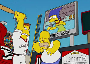 Another batting slump results, and it looks like the couple will split.  Determined to right these wrongs, Homer hijacks the Duff blimp, to flash a fake “I love you – Tabitha” message to the player on the field.  The player responds with a powerful clout of the ball, puncturing the blimp, and sending it crashing onto the field, revealing Homer inside but no Tabitha.  Before the player (and the fans, armed with weapons from a mini-bat night promotion) can lay it into Homer, Marge, who has followed him to the stadium, appears on JumboVision with Tabitha, to shame everyone for picking on Homer for trying to save a marriage, and to let Tabiha send a screen love message to the player for real.  The player remarks, at the close of the episode, that it looks like his marriage is going into extra innings, as Homer and Marge make a triumphant exit in style, in the baseball-shaped golf cart from the Isotopes’ bull pen.