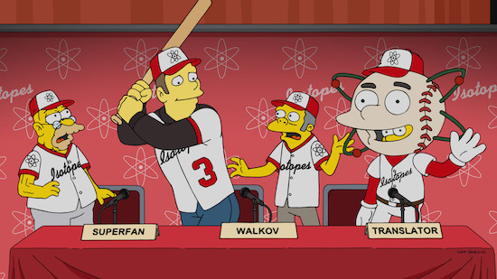 Walkov does not speak a word of English (though he tries to pick up the language from watching episodes of “Family Guy”, only seeming to learn Quagmire’s catch-phrase while woman-chasing of “giggity-giggity”).  So Moe becomes his official translator.  Abe tries to tag along on the coattails of Moe’s and Walkov’s success, but soon finds himself somewhat on the outside looking in, as massive changes take place at the stadium.   Attendance swells until the stadium is packed – and expansions become necessary.  While Abe is finally able to attend Walkov’s first game with Bart at his side, adding Bart’s name to the railing etching, the next game finds Abe’s traditional Section J transformed into exclusive luxury boxes for the filthy rich, and Section J moved to a new column of bleachers piled higher than the flight of the Duff blimp.  The JumboVision screen gas grown to where it almost dwarfs the field itself, and now it seems that everything in the stadium is decked out with sponsorship advertisement – even the basepads.  The broadcasts are as bad, with every play, and seemingly every movement of the players, sponsored by some company whose logo almost obliterates the telecast.  The final straw is when hot dogs cease to be sold by the vendors, their foodstuffs replaced with middle-European specialties.  Abe finally confronts Moe on the field, who seems to be basking in all of this, and accuses Moe of selling out instead of preserving the old game.  In a heated argument, the two break off their friendship.
