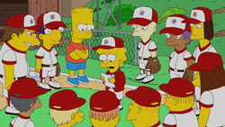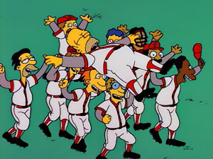 Lisa begins managing by the book, benching players that don’t add up in her positive column of calculations, and keeping the others reined in from taking any uncalculated risks – and surprisingly, the system seems to work (as it did only in regular season play for the Dodgers). The Isotots climb in the standings, and are a win away from taking the division. But the team is restless, and feels like all the fun has gone out of their game – especially Bart, who swears that he will stand up for the game he loves. As Lisa observes that the pitcher has thrown two walks in a row, making the probability of another walk high, she instructs Bart not to swing at anything. Bart feigns a nod, with a facial expression denoting that it is entirely forced, then steps to the plate. Two balls pass him, according to Lisa’s plan. But Bart’s imagination sees Lisa’s face on the oncoming ball, shouting “I’ve ruined your game.” Bart can’t resist his own impulses, and belts the ball over the fence, scoring a home run, and winning the game his own way. Furious Lisa, despite the win, won’t put up with this kind of insubordination, and ejects Bart from the team, losing their best power-hitter.
