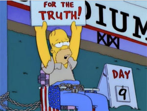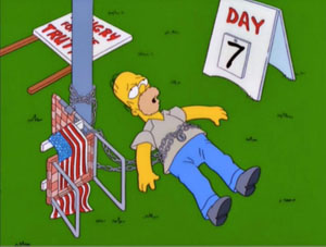 Homer tries to go public with the news, but the executive and Duffman have stashed away all the incriminating evidence by the time the press arrive at the stadium, and paint Homer to be a chronic liar.  To prevent the imminent crushing blow to Springfield sports fans, and at the mention by Lisa of methods of getting attention, such as a hunger strike, Homer vows to do the personal impossible – stage his own hunger strike outside the stadium until the Duff Corporation tells the truth.  He chains himself into a chair, then chains the chair to a light pole – only to too late notice the skeleton of another former hunger-striker left to rot in a chair on the opposite end of the courtyard.  Most people ignore him, but many crowd around him as something of a freak-show novelty to get a few laughs.  Duffman and the executive notice his attraction of attention from a stadium window, and the executive decides this can be turned to management’s advantage.  So, at night while Homer sleeps, a work crew saws the light pole off its base, and transports the pole and Homer to a grass patch just behind the center field fence, where Homer is displayed at the next game as “Hungry, Hungry Homer”.  Homer’s voice of protest is drowned out by the stadium announcer on the P.A. system, who states that Homer’s mission is to not eat until the team wins the championship.