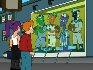 Leela vows to train to become the best Blernsball player ever, until Hermes tells her this is a statistical impossibility – so she changes her resolve to not being the worst Blernsball player ever. She visits a sports museum, where she finds a display dedicated to the current record-holder as the game’s worst – Hank Aaron the 24th, who, instead of being represented by a statue, is actually there as a live exhibit in the flesh, to the disgrace of the preserved talking head of Aaron the first across the hall (Hank Aaron himself providing the voice-over). Aaron the 24th doesn’t want to lose his cushy place in Blernsball history, so volunteers to provide Leela with training. Quickly identifying Leela’s problem from getting struck by another bean ball, the younger Aaron suggests that Leela try keeping her eye off the ball. Leela turns her head the other way from the plate as she hurls a fast ball – and accomplishes her first perfect strike. The trick is the secret to success.