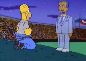 Homer begins to weaken rapidly, also disheartened that no one is hearing his true cause, and eventually becomes motionless on the grass.  The management finally decides his crowd-appeal is waning, and removes him from his chains.  Homer is dragged out before a mike, where the executive and Duffman urge him to publicly break his strike by eating one of the stadium’s newest taste sensation – the Isotope Dog Supreme.  Homer’s will is about to crack – until he notices the ingredients on the dog, including mesquite grilled onions, jalapeno relish, mango lime salsa – Southwestern ingredients!  The kind that would be appreciated in Albuquerque!  The fans who have purchased one realize this is true – especially when they roll back the paper wrapper lining the inside, and find the dogs have been pre-packaged in wrappers turned inside-out, already displaying the logo for the Albuquerque Isotopes.  The jig is up for the executive, amidst the boos and snarls of the irate fans, and even Duffman is swayed by Homer to fight for the little people, leading Duffman to toss the executive out over the fence.  The mayor of Albuquerque, watching the game on TV, turns off the set, deciding that the Springfieders have too much spirit for him to successfully pry their team away.  He thus asks his secretary to ask Dallas how much they want for the Cowboys.  The secretary informs him that the Cowboys are a football team.  “They’ll play what I tell ‘em to play”, insists the power-hungry mayor, as the scene closes upon him with darkening shadows over his face, and an evil look in his eyes.