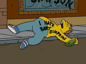 The Boys of Bummer (4/29/07) – The Springfield Isotots little league team is up for a championship game.  Pitcher Nelson has a unique delivery, launching the ball to the plate with a sock from his bare fist.  But the problem is Bart.  While he got the team into the championship by hogging a catch away from Millhouse, stealing his thunder by catching a game-ending fly ball, he can’t repeat the feat under the pressure of the deciding crucial game.  Bart commits the fielding error of fielding errors, letting the ball bounce out of his mitt, booting it into center field, tripping on it, falling all over himself, letting it roll to the fence – and never gets the ball tossed back to the infield, allowing the bases to clear for the winning runs.  He becomes the town’s target of ridicule, and everyone starts throwing pop bottles at him.  Bart escapes the stadium through a side exit, and is intercepted by Chief Wiggams, who offers him a lift in a squad car – only to drive the car back into the stadium, and roll down the convertible roof of the vehicle, subjecting Bart to further clobbering from the pop bottles.   Bart can’t avoid blistering sport page reviews of his disastrous performance, and even morning radio show broadcasts where his schoolmates serenade with a song, “Bart Srinks”.  Finally, Bart cracks under the pressure, and a mysterious run of graffiti messages appears on every building in town, reading “I hate Bart Simpson”.  But who is the graffiti artist?  Bart himself, trying to prove, as he is found marking up the Springfield water tower, that he hates himself more than anybody – so now can they all be friends?  Relentless Chief Wiggams lets slip over a loudspeaker the word “Jump”, then denies having been the one who said it.   Bart drops from the tower, luckily landing in some hedges, but knocked unconscious for a day.