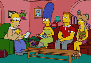 Things take a turn for the worse in Moe’s and Walkov’s fortunes, as Moe encounters Walkov engrossed in activity on his cell phone, of an unexpected kind. Walkov is engaging in on-line betting on baseball, and has become heavily indebted. Moe asks him where he picked up the idea for this habit – then looks around him at the neon advertising displays in the stadium, including prominent ads for sports betting, and gets the picture. Walkov, who had no idea what he was doing was wrong or prohibited, starts self-punishing himself with blows to the head with various items, breaks into crying jags, and announces to Moe his intention to call a press conference to make a clean breast of things. Moe can see this as a recipe for disaster, and tries to recruit Abe for any ideas to help. But Abe turns a cold shoulder to him after the way Moe treated him. Abe, however, finds a reason to attend the press conference, when he discovers that Bart has been influenced by the betting bug and advertisements too, and is gambling (taking a picture of Homer in the middle of a Duff-induced stupor for facial recognition to get online). Abe thus crashes the party at the conference, with Bart in tow.