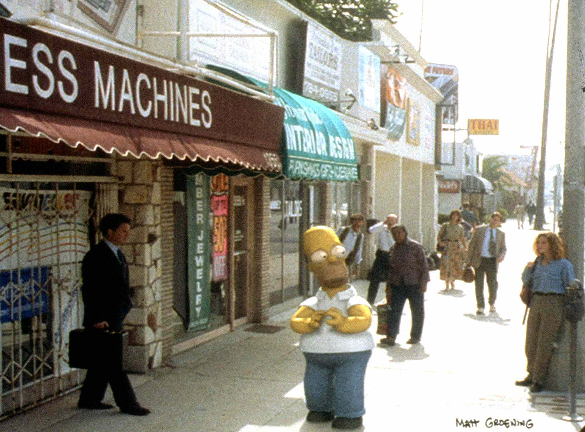 As for the ending, where Homer crosses over into the “real” world, they originally planned to use somebody in a Homer suit, because they didn’t know the CG Homer could be superimposed over real footage (I said this was early, didn’t I?) PDI informed them they could do it, and a section of Ventura Boulevard was shut down to quickly film a tennis ball on a string being carried by a crane out of frame. Painting out visual markers is par for the course now, but PDI was worried…so a retake was shot where someone just walked out of frame and made noise so the extras would know to turn their heads. That take was used.