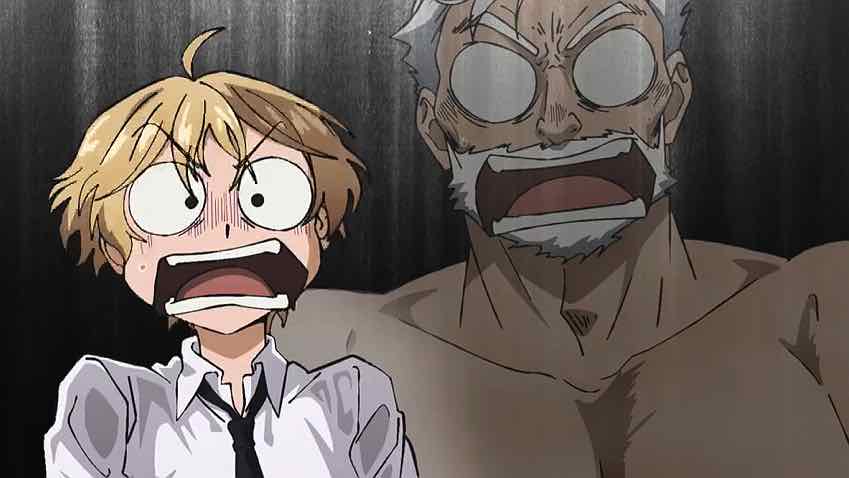 Yagiuda joins the stasff as a P.E. teacher in the interest of taking out Santa. This meshes with the headmaster’s wishes as he wants Santa gone too. Sanda is understandably shocked, and transforms himself into Santa once the two of them are alone, intent on settling things via combat. But he turns back into a boy mid-punch – Yagiuda’s punch – which unsettles the latter. Killing Santa is one thing, but he protests that he has no interesting in taking out a child. In fact if he can’t prove Sanda is Santa he can’t claim his head and save his job, which makes the two of them unlikely allies for the moment (a development I foresaw might happen).