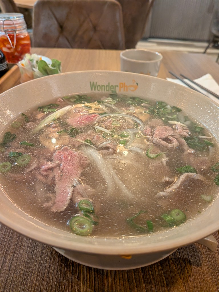 Rare beef Pho (£12.80) arrived whilst I was half way through my rolls. Delightfully steaming in its custom WonderPho bowl. I was impressed with the broth, more so than at the original shop. The depth and umami here was lovely and the beef some of the most tender I’ve ever had with pho. It wasn’t quite perfection though, the flat noodles were unfortunately overcooked and approaching a mushy texture.