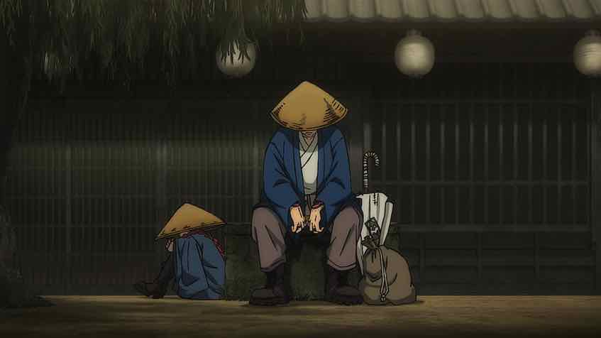 Zanka takes his shame so badly, in fact, that he crawls down a well and stays there for three days. This comes after the final humiliation, when during a weapons selection test he chooses a stick that was left on the table by mistake, trying to be contrarian. Eventually two travelers come along and talk to him. Only one of them talks but it’s immediately clear from the voice that it’s Enjin (and eventually – from the hair – that the other is Riyo). Did he come specifically to recruit the boy, or was this a fated chance meeting? In any event Enjin – who’s way better with kids than he would have you believe – inspires Zanka to climb out of the well and face the music that is his life.
