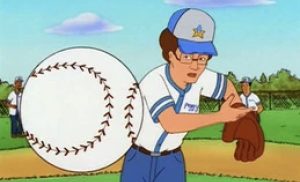Take Me Out Of the Ball Game (Film Roman, King of the Hill, 5/11/99) – This title is becoming second runner-up to “Play Ball” as the most reused title in baseball cartoon history. Strickland Propane is forming its own softball team, joining a circuit of local business teams in an informal league of commercial rivalry. Hank Hill is appointed coach. His first job is coming up with a team lineup, and he learns the league requires a female in the spot of pitcher. Immediate family are permitted to play, so Hank immediately thinks of his wife Peggy, who pitches already for a local girls’ team. However, Hank hasn’t exactly been supportive of Peggy’s pastime, having never attended any of her games (Tuesdays being one of his regular beer-drinking nights with the guys behind the fence). Peggy turns the offer down coldly, stating she is already pitching for a good team, though Hank touts the new team as “a chance to play against the big boys” – i.e. guys. Even coaxing Peggy down to the field on excuse of helping carry the equipment does nothing to sway her to join. Only the trash talk of a rival businessman on the sidelines, checking out the Strickland team, changes her mind, as she hears him badmouthing about how girls don’t know how to pitch. Determined to prove him wrong, Peggy strides to the mound, and tells Hank, “I’m in.”