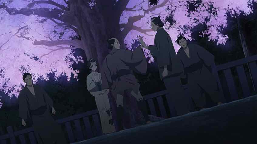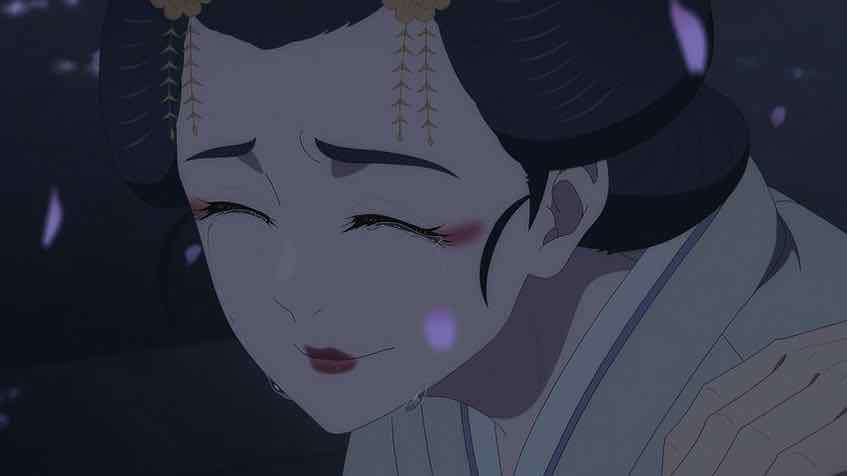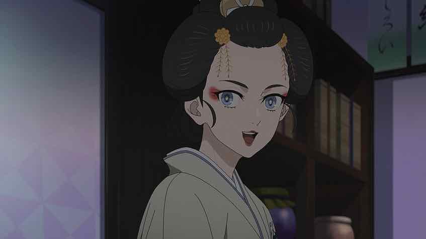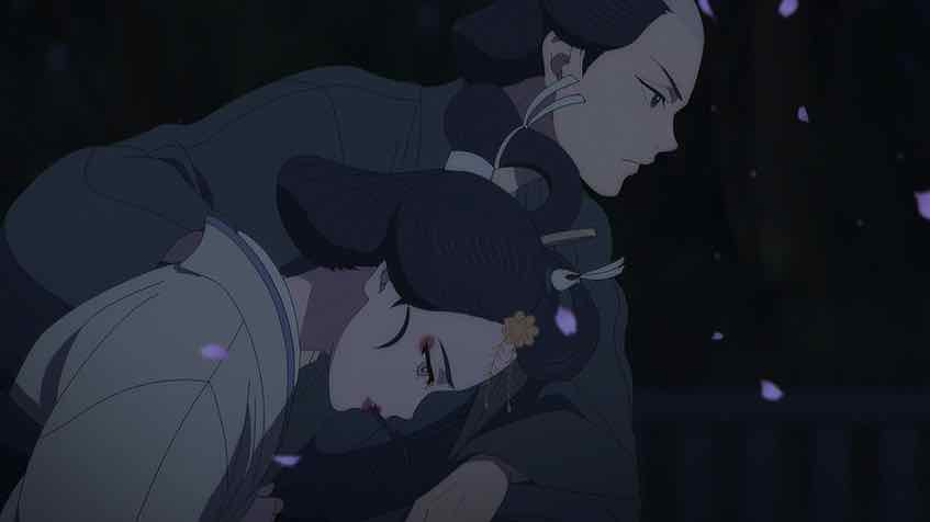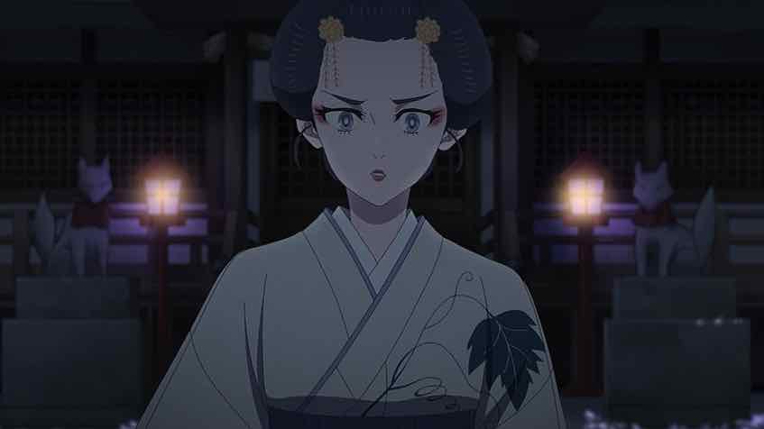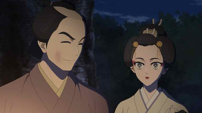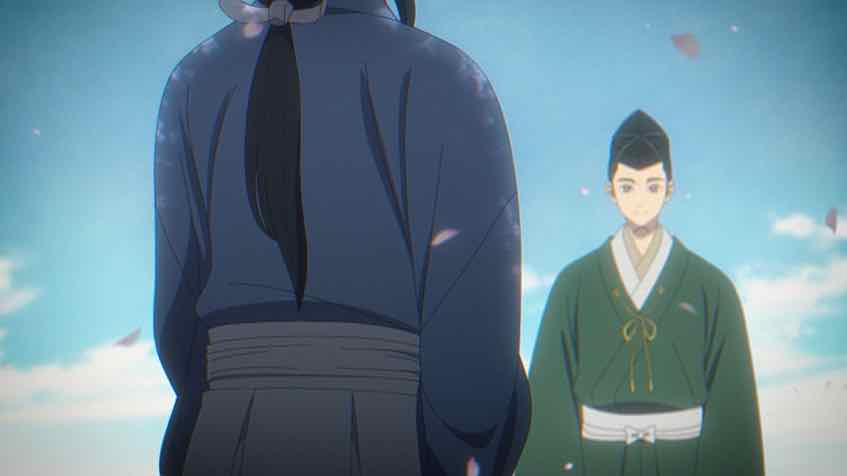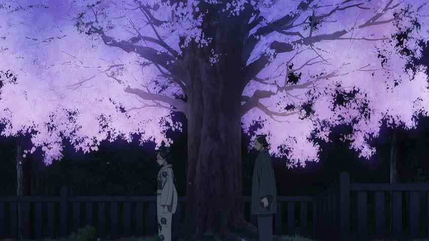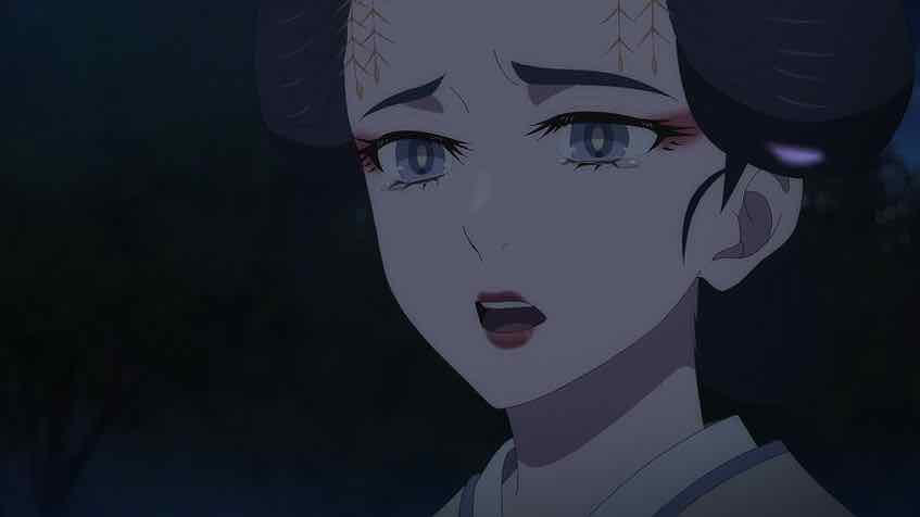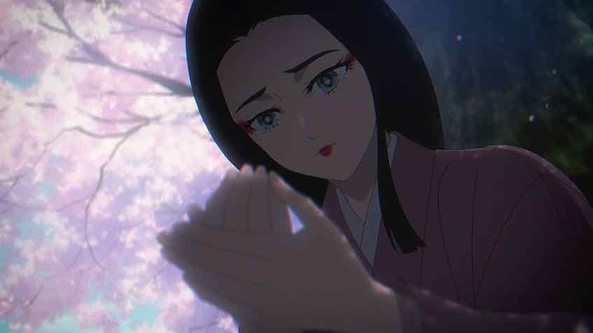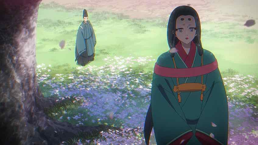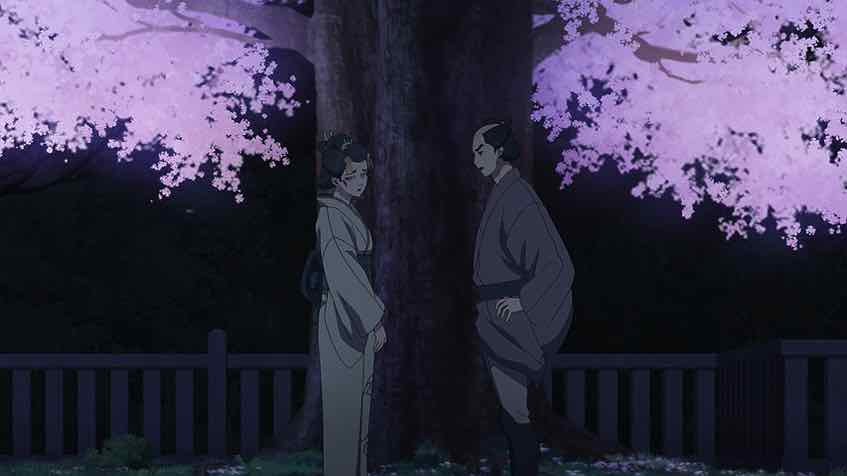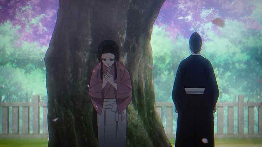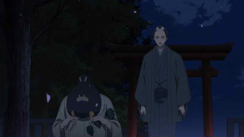 As teased last week, we got a Nikichi- well, not an origin story (who knows how far back that would go). But a background story at least. A thousand years or so, back to the Heian Era. Nikichi has had this sideman gig for a long time, it seems. For most of the intervening millennium he dutifully stood at the side of Oyoshi (Yoshino), a spirit who chooses to live among humans. Nikichi is in love with her, but those feelings were never reciprocated. In fact Oyoshi falls in love with a human named Lord Bell. But humans in any era are short-lived compared to youkai, and certainly that one. After only five years he passed away, leaving her bereft but determined to wait for him to be reborn and return to her side.