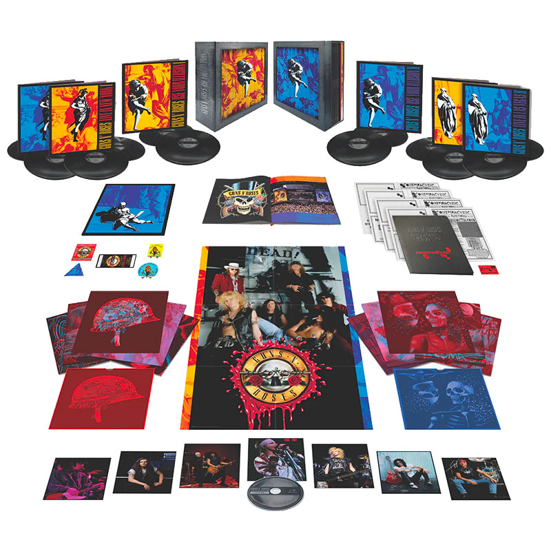 The Use Your Illusion Super Deluxe 12-LP and Blu-Ray box showcases both album covers in an anamorphic illusion. It includes 97 total tracks, 63 of which were previously unreleased. Other features for this great gift include an 100-page hardcover book with unreleased photos, memorabilia, and archival documents. Additionally, Use Your Illusion I & II are available in limited edition vinyl editions in colors like yellow, red, blue, and purple.