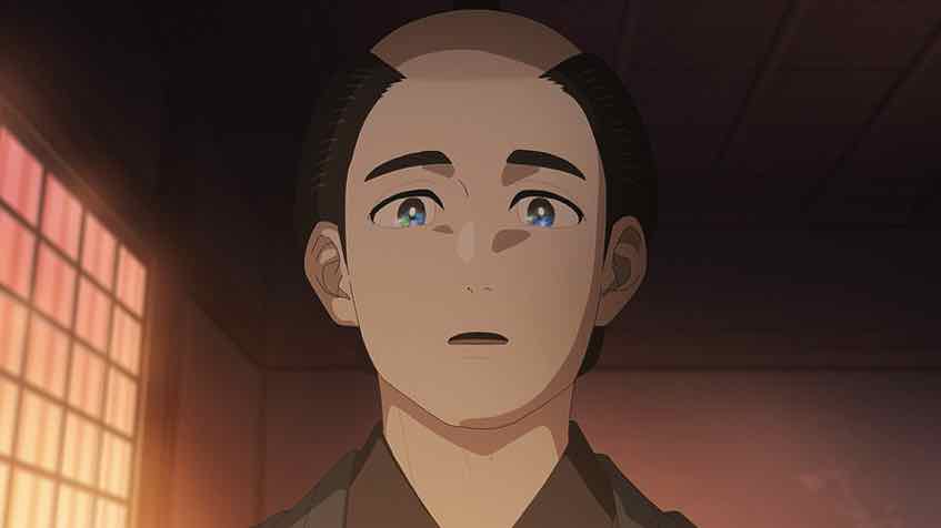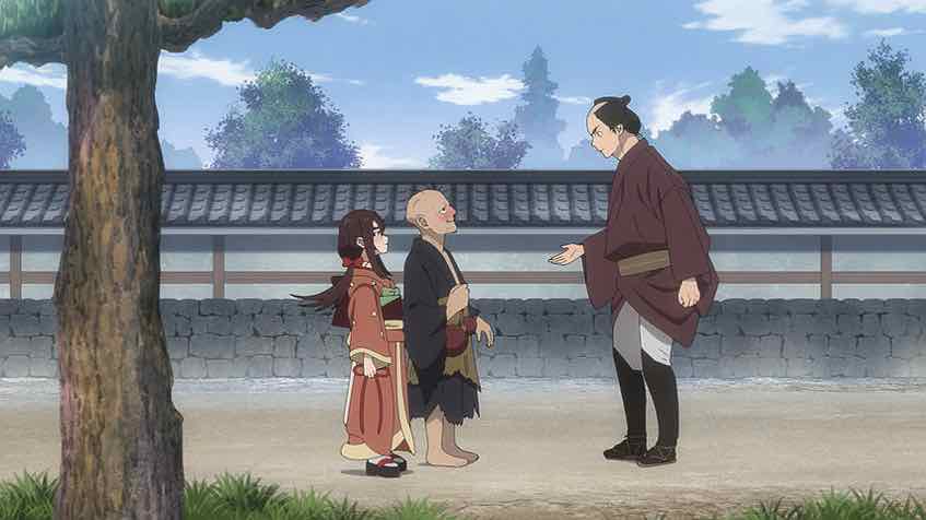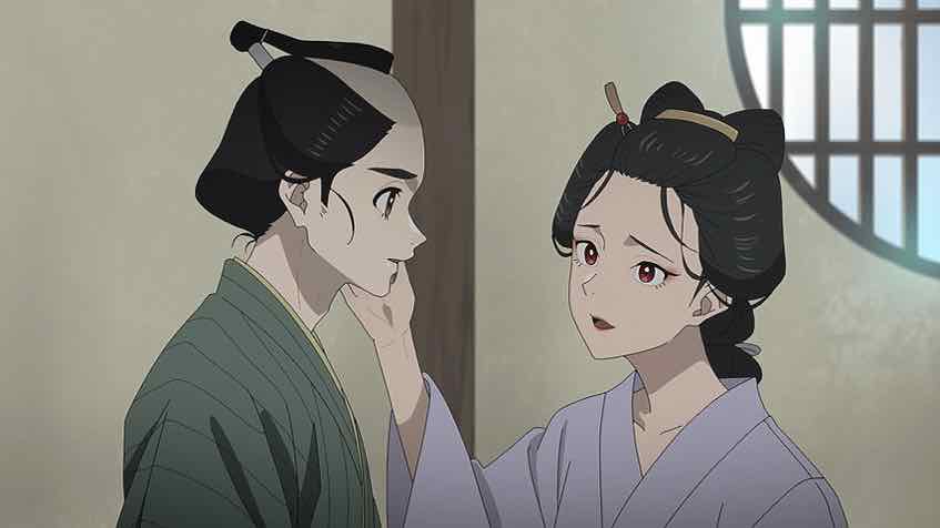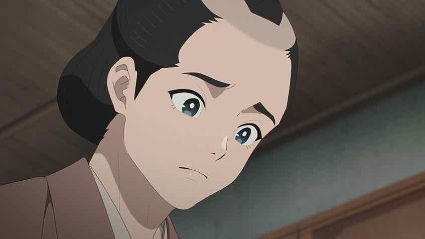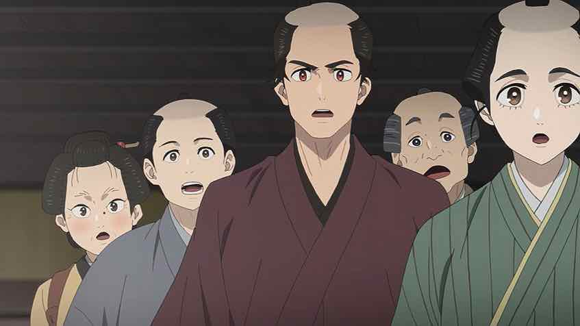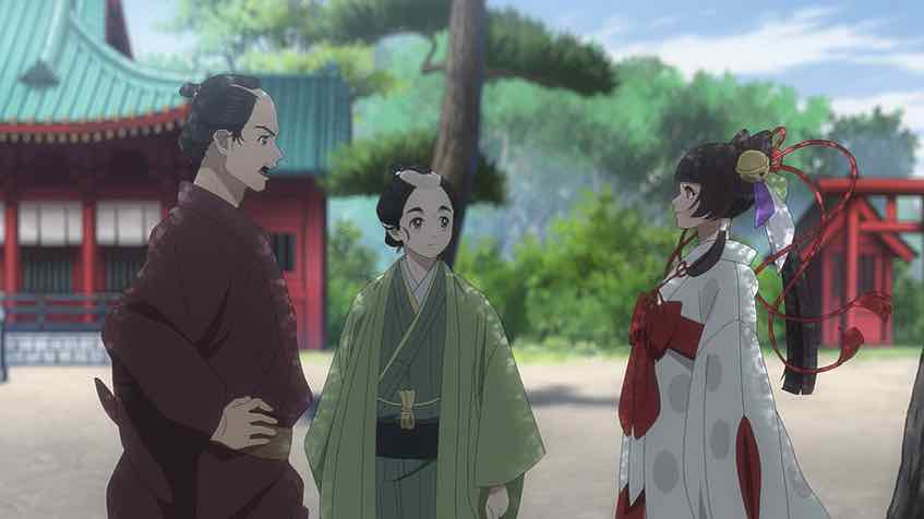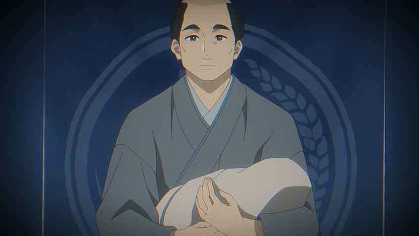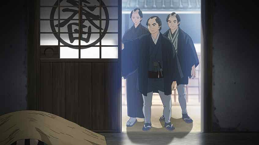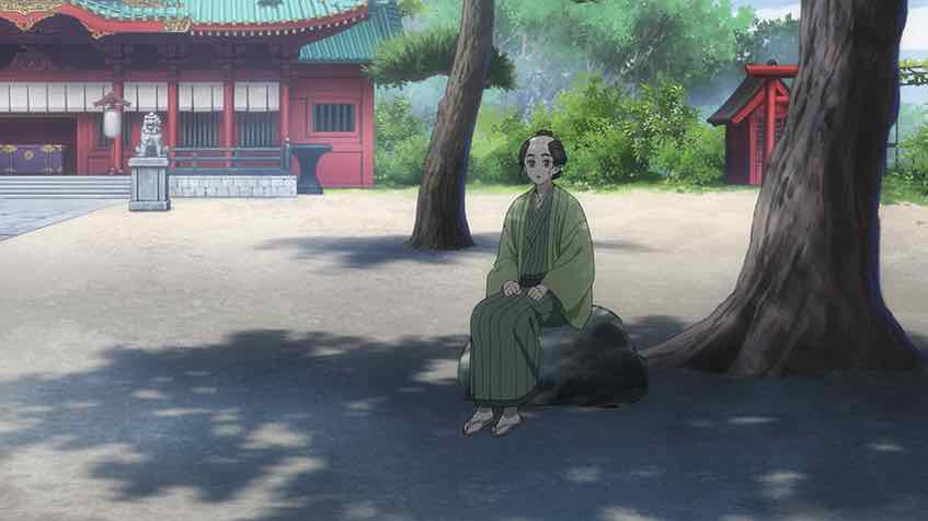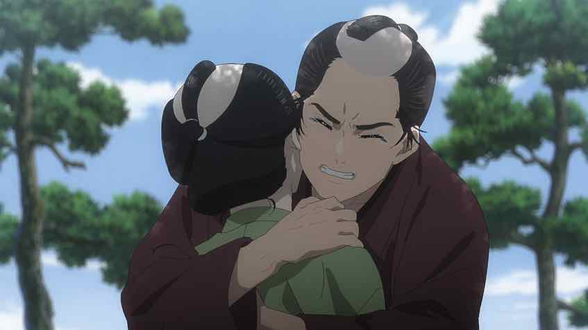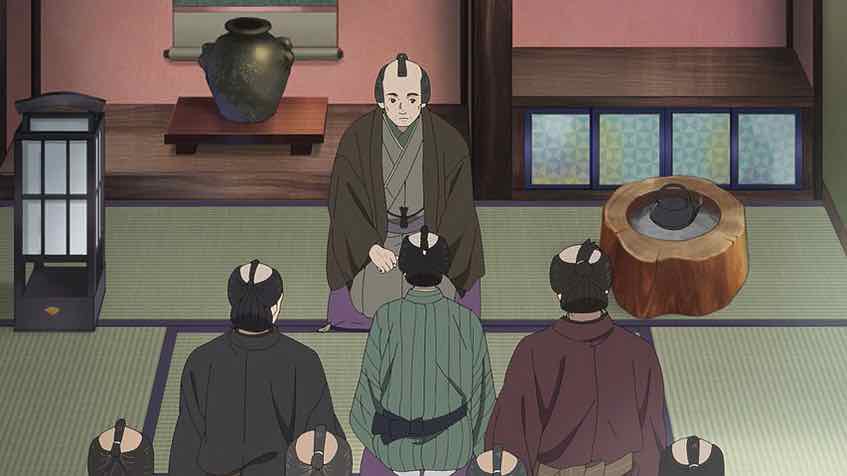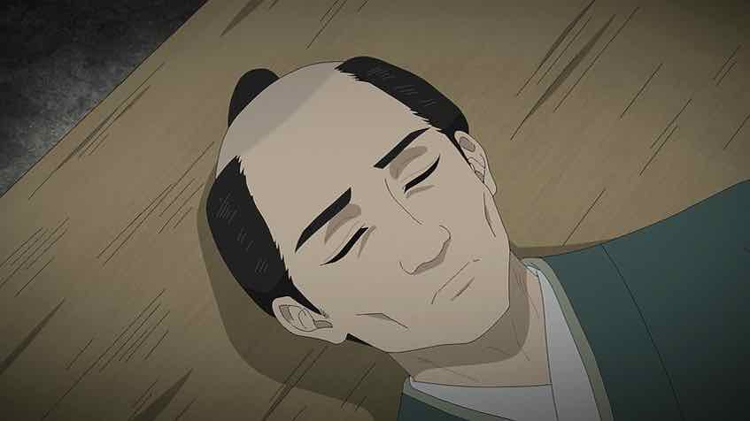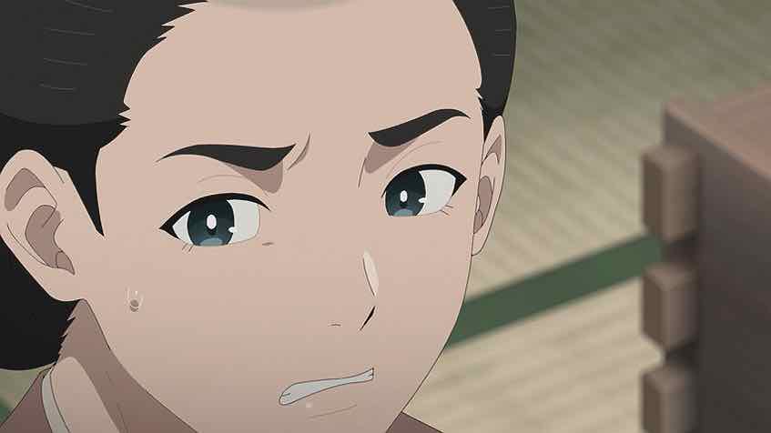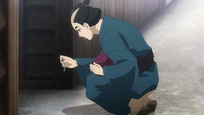 The murder of a temporarily unnamed apothecary certainly sets the shop and household into a panic. Nikichi pulls his usual strongarm tactic and tries to strangle a confession out of Eikichi when it comes to the young master’s going’s on. The truth about his secret trips to see Matsunosuke comes out – though it seems as though Ichitarou and Matsunosuke (who’s working as an apprentice at a cooperage) have actually met yet. Nikichi and the chief head off in search of answers, and Sosuke – who’s been searching on his own – finds Ichitarou on his own at a shrine.