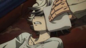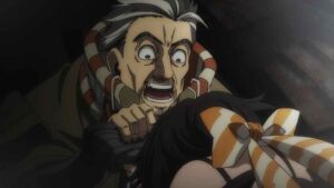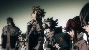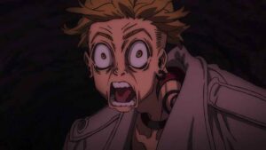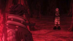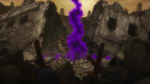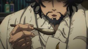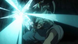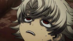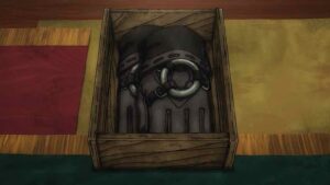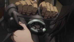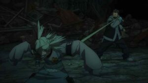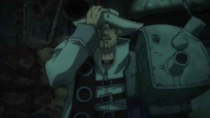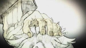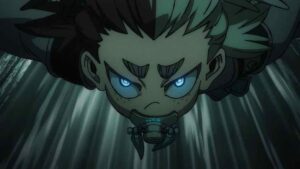 The biggest developments, however, come with the Bundus group. As with Enjin the realization that they’re inside a trash beast has prompted Bro and Dear Santa to stop waiting out their passive opponents. Anime’s other boy Santa takes center stage, as we finally see his and Bro’s Jinki in action. Not only that, Dear finally speaks (in the voice of Saitou Hana). It’s only one word, but that word is “Centrelian” – the name of his vital instrument, the ever-present pacifier. As for Bro his Jinki is “Cloth”, which he promptly uses to hurl Dear through the air (much to Bundus’ surprise).
