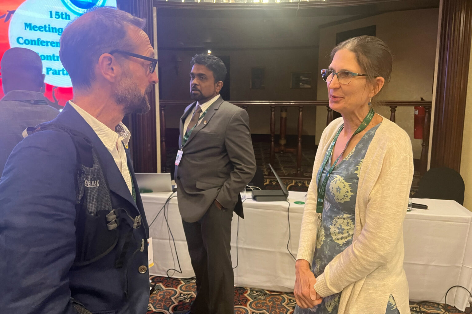 Gillian Davies speaks with a colleague after presenting at a rights of wetlands side event at the 15th Conference of the Parties to the Ramsar Convention on Wetlands in Victoria Falls, Zimbabwe, on July 28. Credit: Katie Surma/Inside Climate News