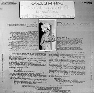 Channing also reads another of Phyllis McGinley’s Christmas books, 1963’s How Mrs. Claus Save Christmas. This story is about a Christmas without Santa, and like Angela Lansbury’s delightful TV musical Mrs. Santa Claus, she does the famous ride. In this case, she adds a decidedly different touch to the selection of the presents for the children receiving them.
