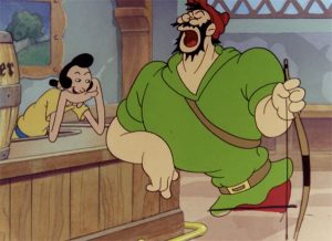 Did Bluto ever appear bottomless? Well, at least once. Thus came about in Famous Studios’ Robin Hoodwinked (11/12/48). Famous was generally a well-organized studio, whose artwork (with the exception of a few productions by Jim Tyer) exhibited clean lineage and fairly meticulous painting, rarely showing any signs of error (though a possible exception would be a wrestling sequence involving a hippo which first appeared in a Screen Song and was also spliced into “Sportickles”, where a new color paint chosen for the hippo did not spead evenly, and came out looking blotchy from cel to cel). In fact, the error in the case of the Bluto appearance could in no manner be attributed to either the animators or ink and paint, who each did their job in the customary manner. Instead, the fault seems to rest with the layout department. It’s hard to tell what sort of large object was supposed to appear in the foreground in the setting of Olive’s tavern. (A table? An ale barrel?) But it is clear from the way a scene was set up that something in the form of a stationary prop overlay was supposed to appear on a separate cel, to be placed over the top of the animation of Bluto, to partially eclipse him. Instead, the elusive cel of the object seems to never have been delivered to the cameraman – or else was carelessly overlooked by him in setting up the shot. The result was that the cels of Bluto were photographed fully revealed in the foreground, just as they had been completed by ink and paint. This might have been all right if the animators had not been tipped off in advance than an object was supposed to be in the foreground. Knowing this, the animators only drew Bluto down to the hams of his legs, never completing the drawings to extend the lineage of his limbs down to the floor. Ink and paint, having no clear guidelines as to where character ended and prop was to begin, randomly painted each cel only so far as they believed the leg outlines would extend, each cel different from the next and previous, with the brush strokes ending at different positions and elevations – all expected to be covered up in the final shot. With no covering provided to the camera, we see the hilarious behind-the-scenes result at approximately 3:30 (1:16 in the excerpt below) of Bluto defying gravity, transported in air upon legless limbs, with color edge bobbing randomly up and down with every change of position! One of the most outrageous errors to hit the big screen, looking like someone accidentally released a pencil test painted in. We can surmise just how the error happened – but can anyone explain why it wasn’t caught for a reshoot?