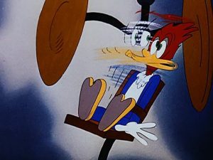 Perhaps my favorite disappearing trick of all was one which might have slipped by if the cameraman had just stuck with his error through the duration of the sequence, but instead, the error was caught only after the LONGEST time, with disastrous results. The scene takes place in the Walter Lantz Woody Woodpecker short, Smoked Hams (4/28/47). At approximately 1:13, Woody Woodpecker, night sleeper, is awakening just at the commencement of bedtime for Wally Walrus, day sleeper. A cuckoo-clock alarm above Woody’s bed features a Germanic figurine which empties a small bucket of water into the snoring Woody’s throat. Woody awakens gagging and coughing, emitting one very loud cough to spit out the last traces of water. As he performs such cough, the oversize pillow upon which he has been resting his head suddenly disappears. The synchronization of its disappearance with Woody’s cough at first makes the viewer explain what he is seeing by thinking, “Did Woody cough hard enough to cause the pillow to disintegrate?” A strange notion, but the eyes might have accepted it – if the pillow had just remained out of view for the rest of the scene. Instead, after a good two seconds of absence, the pillow returns! – remaining fully visible for at least another five seconds, giving the audience full opportunity to register its magical comeback. Worse yet, the pillow hasn’t moved from its lasr-seen position, and did not seem to be involved in any of the action of Woody following his cough – so it does not appear that there were any cels omitted from delivery to the camera room. Could someone have overlooked providing instructions to continue to leave the pillow cel on the screen during Woody’s action? If so, why would this get picked up again later in the instructions for the end of the shot, when there is no clear indication of any action by the pillow to even require a change of cel? It seems considerably more likely that, even if the instructions forgot to mention to use the pillow cel upon Woody’s cough, they likely never brought up the subject again for the remainder of the shot.