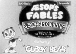 This cartoon, starring Cubby Bear, was one of the first Van Beuren cartoons I ever saw, having purchased a 16mm print from Frank Bueno’s $5 table at the Columbus Cinevent in 1983 or so. All of those prints were pretty beat up, and I bought two prints of it and put them together to make a pretty complete one.