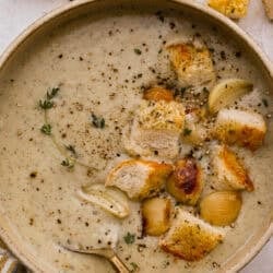Bowl of roasted garlic soup toped with croutons, garlic cloves and pepper.