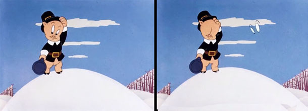 That’s exactly what happened in this film, during a sequence where Porky is repeatedly getting pelted with snowballs thrown from a distance. As Porky tries to figure out from where the ice-cold ammunition is being thrown, we get the unique view at approximately 4:45 of an eyeless Porky, with an odd pair of solid white ovals visible in the sky to screen right. No, those ovals aren’t more snowballs. They are Porky’s missing eyes, seen from the back side of an inverted cel. Since the ink outlines are painted over from the rear side, we can’t see any irises in the eyeballs – only the white paint covering the entire eyes. For those kids who might have been sharp-eyed enough to spot this but unfamiliar with how a cel works, those strange white mystery “snowballs” appearing and disappearing again must have led to confusion no end.