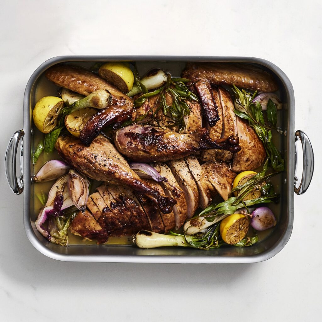Made of heavy-duty stainless steel with an aluminum core, this roaster features high sides to reduce splattering and generously sized upright handles that are easy to grasp.