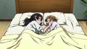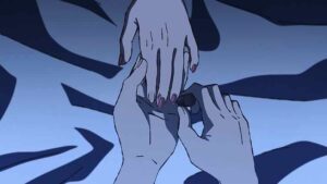 Meanwhile Oono is putting her relationship with Fuyumura to the test. She feels Fuyumura slipping away from her (quite accurately) but isn’t willing to let it happen without a fight. Even she’s aware than having the pair of them strip naked has a strong air of wrongness to it – they may be the same chronological age but it’s obvious that in this twisted reality, that’s meaningless. It’s beyond telling that Fuyumura winds up fleeing into Sanda’s arms, even if she begs him to bring back the Oono she knew. I don’t think Santa can do that, and I don’t think Fuyumura’s feelings can ever be transferred to the person Oono has become.