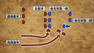 Unsurprisingly Wang Ben scoffs at these orders. And this is tricky. For a high commander to keep his son’s army ought of battle could be seen as protectiveness or – far worse for the son – a lack of confidence. His own veteran aides-de-camp urge patience, reminding him that Ya Guong has become Wang Jian’s most trusted man for a reason. Ya Guong is a straightforward warrior, disdaining clever tactics for overpowering an enemy with sheer strength and ruthlessness. He appears to gain the upper hand on the enemy under Yue Ying, which draws Ma Nanci – one of the titans of the Zhao army – into the fray.