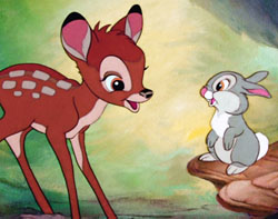 A more subtle problem occurred in Bambi (Disney/RKO, 7/13/42). Thumper is seen in an extreme close-up head shot, his eyes dilating and then freezing into a stupor, as an attractive female rabbit shows off her stuff, then waves a coy hello at him. Thumper’s face remains nearly motionless, but the tip of his ear slowly and reflexively bends, returning the wave of “Hello” to the girl. Each time the ear tip bends, one cel of Thumper’s nose is miscolored, apparently by some misblending of the shade of pink paint applied, so that the cel flashed is a paler, whiter tone than the others. In a smaller, more far-away shot, this blemish might have gone unnoticed. But when the nose fills about a twelfth of the screen in the foreground, it’s hard not to notice the blink. The Disney digitizers have once again caught this upon reissue, altering the nose color to one uniform hue throughout the shot on the DVD versions. You again have to own the original VHS, or the 8mm/Super 8 200 foot release of “Bambi Falls In Love”, to see the unaltered original.