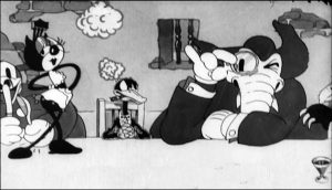 A classic example of a cycle (or perhaps several) gone wrong occurs is what to date appears to be the only surviving cartoon of the fledgling Romer Grey Studio, Hot-Toe Mollie (1930) starring Binko the Bear Cub. Watch for a scene at approximately 4:49, one of the most elaborate in the cartoon, as cantina dancer Mollie performs atop a long dinner table, passing between two rows of seated characters either admiring the dancing or too busy wolfing down food to really take notice. Midway along the table appears a large elephant with a monocle. It’d be hard enough to miss him just from his size – but when one of his repeating cycle of cels is erroneously traced about a quarter-inch farther to the right than the others, the effect is jarring, repeated about five times, with the viewer struggling to understand why the pachyderm is taking a sudden jolt on every pass during the shot. Of course, this early, and possibly unreleased, work is, as you might expect from a possible first effort, loaded with other cel and painting errors of various kinds, though a certain amount of shots surprisingly work competently. Some I took note of included a color flash from black to white on the gorilla’s ears when seen eating spaghetti. And a staircase which buckles under the weight of an oversized pig, but more notably changes from gray to white as its steps give way. Feel free to remark if you have your own favorite errors, or try to catalogue them all.