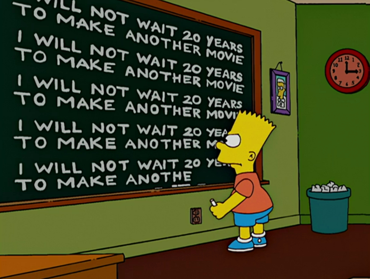 This is from the main title sequence to the Season 19 opener “He Loves To Fly And He Doh’s,” which rearranged the familiar scenes of the family journeying home to mix in the aftermath of the movie’s events. Had The Simpsons Movie 2 stuck to its July 23, 2027 release date, it would have kept this statement true, beating the July 27, 2007 release of the first movie by four days. Instead the Labor Day move pushes it past that mark, making Bart’s chalkboard a complete lie. HA ha!