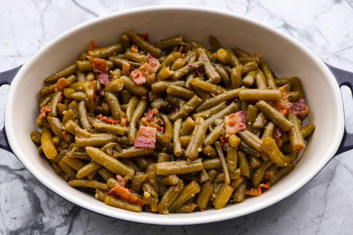 Crack green beans are the side dish that guarantees seconds! Tender green beans bake in a sweet-savory buttery sauce with smoky bacon. These are simple to make, wildly addictive, and gone in minutes.