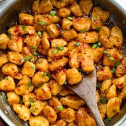 Add Sauce & Serve: Pour Thai sweet chili sauce and toss to coat well. Garnish with diced green onions, if desired. Serve sweet chili chicken over rice and enjoy!