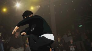 Kabo longs to comfort Wanda after her loss, but naturally hesitates, and it’s On-sempai who steps in. Wanda will be fine – she’s 15, a tear or two is no sign of crisis. Next up Usen faces off with Iori, not for the last time one suspects. This starts off with Usen’s crew staring Iori down, only to have Wanda and Kabo (adorably) step in to fire faggers back at them. You get that the mutual respect here is very real – and very much merited. These guys are good, very good. Usen specializes in hip-hop and the first tune favors him. The second is house (I assume the DJ does this intentionally to level the playing field (dance floor). But Usen sticks to his vibe – he just dials it up to eleven.