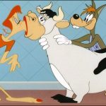 Little Rural Riding Hood (MGM, 9/17/49 = Tex Avery, dir.) – The tale of the country mouse and the cty mouse had been kicking around in cartoons for years, and had already won Disney an Oscar in the mid-thirties. But the Country Wolf and the City Wolf was Avery’s new twist. Of course, what do wolves do in Avery cartoons when they’re not chasing pigs or sheep? Chase girls! However, there’s a lot of differences in style and taste between the country and city varieties. The Country Wolf (voiced by Pinto Colvig) pulls the old routine as Red Riding Hood’s “Grandma” to get within reach of a freckle-faced, no figure, skinny as a rail lumpkin of a female who is the country version of Red, with the intent not to steal her basket of goodies, but to kiss her, and hig her, and love her. Country Red, however slow-witted she may outwardly appear, is fleet of foot, and leads the wolf on a merry chase through the house, including Avery’s oft-used unhinged door gag that opens a new pathway for chasing anywhere it lands, and a mistaken lunge for Red by the wolf that results in him kissing a cow. The wolf finally gets Country Red in his arms, and Red is about to succumb, painting her lips with lipstick and settling back for the nevitabe smooch – when a telegram s delivered to the wolf. It is from his city cousin, who boasts, “Quit wasting your time on that country gal. Come to the big city, and I’ll show you a REAL Red Riding Hood.” A photo is enclosed – of the Red we know and love from Avery’s original “Red Hot Riding Hood”. Country Wolf’s eyes bug out, in the manner that only an Avery character can do. When Country Red still insists, “Kiss me, my fool”, Country Wolf leaves her kissing the cow, and zooms off as fast as his old jalopy will carry him to the big city.