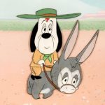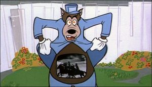 The Three Little Pups has Avery’s Southern wolf (to seen again in “Blackboard Jumble”) accidentally swallowing a TV set through a straw, then tuning in another old Western, lit up through his belly. The wolf tunes out by twisting his belly button, complaining that “I seen that one last night.” At the end of the film, he makes the ultimate adaptation to the medium, stating to the audience as to his final scheme to blow Droopy and his brothers up with dynamite, “If this don’t work, why…I’ll go into television.” The blast blows apart about a full city block, but misses Droopy’s house entirely, leaving it standing fast in the center of a crater canyon. Inside, Droopy witnesses a new and unusual sight on his TV screen. A wonderfully executed shot appears in black and white, featuring a live-action horse passing in a tracking shot at varying distances from the camera, with an animated overlay of the wolf in fill cowboy outfit, riding tall in the saddle, and shouting “Howdy, you all”, then galloping off into the distance for the fade out. The effect rivals anything in “Roger Rabbit” for the smoothness of animation and seamless mesh of the live-action and animated worlds.