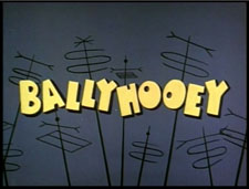 Ballyhooey (Lantz/Universal, Woody Woodpecker, 1/2/60 – Alex Lovy, dir.) finds Woody sitting before a set in his living room, trying to adapt to the experience of watching his favorite TV game show, “Win the Whole Wide World”. The only problem is, it’s quite difficult to concentrate on any game, when the entire proceedings is prefaced by an endless run of commercials, from the show’s sponsor, alternate sponsor, and alternate-alternate sponsor. Woody is burning up with frustration, and is finally forced to stifle the endless jabber by wearing a pair of earmuffs, and falls asleep. The announcer ultimately has to scream for everyone to “wake up” when it is finally time to reveal the prize question: “Who is buried in Grant’s tomb?” Woody is sure he has the answer, writes it on a piece of paper, and races to the TV station to be the first one to provide it. He wrestles with an over-zealous usher who believes no one should be permitted entrance to the show in progress, accidentally punctures with his beak a “puncture-proof” tire advertised by the Goodgrief Rubber Company, but finally makes it to the show. He hands his written answer to the show’s host, who reads it out loud with surprise and confusion: “Napoleon?” The host consults with two old professors with beards who act as research consultants, and the conclusion is reached that the answer is wrong. The correct answer is – George Washington. But Woody wins a consolation prize – a trip South for the winter, all expenses paid. It is not as Woody expected. Woody spends the winter shivering in an igloo at the South Pole, with only a portable TV set inside for entertainment. The game show, “Hi-Ho Eskimo” begins on the screen – but launches into its own series of “words from our sponsors”. “Oh, no”, says Woody, pulling out a pistol, and shooting three holes in the TV screen. The host falls and disappears out of the picture frame. Then the screen image is replaced by a card, reading, “Due to difficulties beyond our control, the picture has been interrupted.”