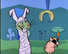 Chilly has set up an assortment of drums in Mr. Stoop’s office, and is about to his the largest one with a huge wooden mallet. Smedly drags Chilly outside again, only to be hit by the mallet, and crack into a hundred pieces as if a shattered piece of pottery. Chilly neatly disposes of the mess with a dustpan and broom, depositing Smedly’s bits into a trash can. Reassembling himself, Smedly pursues Chilly back into the studio, but loses track of him. As Smedly peers out from behind a curtain onto a vacant stage, Chilly takes up a position in the seat of a large TV camera. He begins to play with the buttons of the camera for producing special effects. A “split-screen” button dissects the black and white image of Smedly in the camera lens down the middle, then crosswise, into equal halves – but it appears the real-life Smedly is somehow feeling the painful effects of the process. A “distortion lens” inflates and deflates parts of Smedly’s anatomy like a balloon, then warps his whole body as if made of rubber. In another continuity inconsistency, a third button appears which not visible in the backgrounds of the long shots, appropriately labeled “close-up”. The in-lens vision of Smedly is immediately brought to a point as if his nose were almost touching the camera – and it appears the real-life Smedly has been drawn there too, visibly snarling! Chilly beats a retreat, and Smedly attempts to follow his progress on a bank of TV monitors. Chilly appears on one screen with his image flipping with an unstable vertical hold. Smedly’s eyeballs exhibit the same flipping pattern vertically. Chilly runs through various sets, collapsing a used car in a commercial, jostling the hand of a woman pitching a brand of make-up so that she draws a moustache upon her face, and appearing under an old cowboy’s Stetson hat. Smedly finally gives chase again, catching up with Chilly on the set of a refrigerator commercial. Both characters race inside the refrigerator, and the door closes. As a saleslady attempts to show off the refrigerator interior on camera, Chilly emerges, used to the cold, but Smedly appears in solid blue, caught in the refrigerator’s instant “deep freeze”. The scene dissolves to Mr. Stoop’s office, where he has taken a break from script-reading to watch the day’s broadcasts on his own set. He is rolling with laughter at what he has seen, and declares he has found his new show. The scene returns to the present, for the premiere of the “I Love Smedly” show (a title lampooning the perennial “I Love Lucy”). The curtain opens to find Chilly, armed with a tall stack of pies, and pitching them one-by-one and the motionless Smedly. Between layers of purple goop upon his face, Smedly closes with the remark. “There’s no business like show business.”