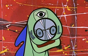 Clampett remembers his roots, having Cecil utter the line. “Eh, what’s up pops?” He also gets away with underscore using a few actual bars of “Merrily We Roll Along”. “Don’t Bugs me, man, don’t Bugs me!”, quips the Wildman, painting a giant carrot and stuffing it in Cecil’s mouth. The final sequence has Van Gogh painting an entire coffee house for himself with a paint roller, then the outlines of musical instruments to provide cool music. Beany, Captain, and Crowy finally catch up, and with a few flings of his paintbrush, Van Gogh transforms all of them and Cecil into beatnik outfits, with dark glasses, goatee beards, and berets. “Oh, well, if ya can’t beatnik ‘em, join ‘em”, concludes Cecil. The cast recite in beat “Twinkle twinkle, little beatnik”, at the conclusion of which Crowy remarks, “Endsville.” An iris out begins, not round, but with the walls of the camera frame closing in from all sides. Van Gogh reaches forwards, stopping the closing sides, and steps out through them, stating, “Man, I don’t dig anything that’s square.” Before he can turn around, the sides have succeeded in closing behind him, shutting him on the outside. Van Gogh bops his nose trying to go back through the now solid blackness, and turns again to the camera, his nose throbbing to a bongo beat, for the curtain line: “How far out can you get?”