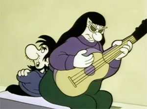 King Features was also prone to satirize the beat generation. Coffee House (Popeye, circa 1960 – Jack Kinney, dir.) was a last memorable instance of Popeye being out of step with Olive’s obsession with current trends. Olive exchanges her blouse and skirt with the stripe for a pant suit, turtle-neck sweater, beret, and round spectacles. Her hair comes down instead of being tied up in a bun. When Popeye rings at the door, she addresses him in beat talk. “Enter my pad. Gimme the hug, big brain.” Popeye appears in shock. “Olive, speak to me. I better call the doctor. Has you had it long?” Not cool. Olive is not only nonplused, but expected someone else – who makes his arrival driving a motor scooter through the door, knocking Popeye down. Bluto (again renamed Brutus for television, but we’ll call him here by his right name) is also decked out in similar garb to Olive, and makes a point of turning his face to Popeye to point out his new invulnerability to Popeye’s fisticuffs, thanks to part of his wardrobe change – “Glasses, Daddy-o”. Bluto and Olive embrace, and begin a string of mutual verbal compliments to each other in classic beat phrases, including “Crazy”, “I dig ya the most”, “You’re the coolest”, “Nutty, frantic”, “The end”, “From outer space, gone.” Popeye’s head looks las if it’s watching a ping pong match, and all he can remark is “What’d ya say? What’d ya say?” Snapping her fingers, Olive responds, “In Squareville we mean, get lost sailor. We’re real gone, but you – go!” Bluto adds, “Yeah, go – like far out”, socking Popeye into a window frame and rolling him up in a windowshade. Bluto then stuffs Popeye into the back of the TV set, emphasizing its “square” picture tube. Popeye tries to block the front door, but Bluto’s scooter runs Popeye over again, and also carries Olive off astride it. Popeye vows he’ll break up that “combo” if it’s the last thing he does.