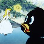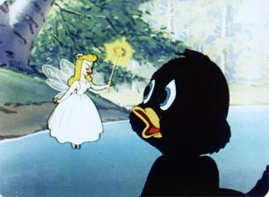 His mother comes along during his attempted performance to the woodland creatures and tries to take away his song book. Dinky goes and pouts by the river, and a very white, tiny (human?) fairy comes out of a Lilly pad flower and grants Dinky a voice. Why wouldn’t it be a duck fairy? He doesn’t need to prove himself brave and truthful or anything, or take magic pills or sell any brushes at least.