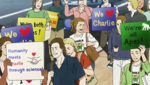 As this storyline develops, Darwin Jihen begins to veer off the broader animal rights theme and onto the specifics of a non-real situation – Charlie’s. This is more akin to something like the brilliant Star Trek: The Next Generation episode “The Measure of a Man” – which explored similar questions of an unfamiliar sentient form’s rights. For now things are playing out exactly as Feyerabend said – Charlie is property in the eyes of the law, and as such entitled to no protections whatsoever. This doesn’t seem to bother him so much, not that you could tell if it did. But it certainly motivates those around him to struggle for change.
