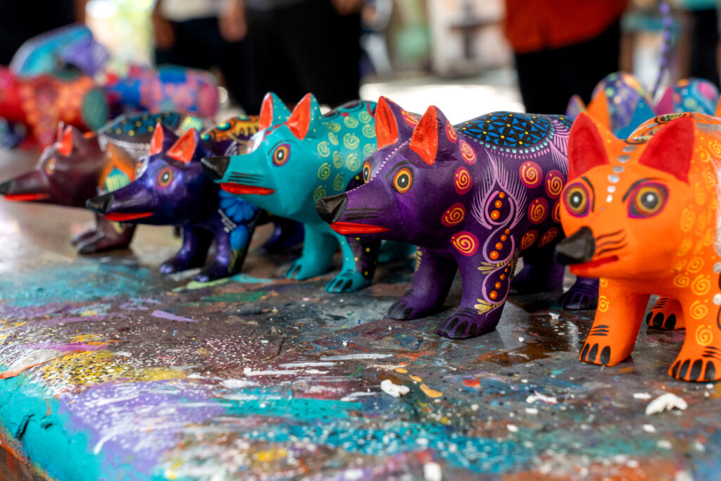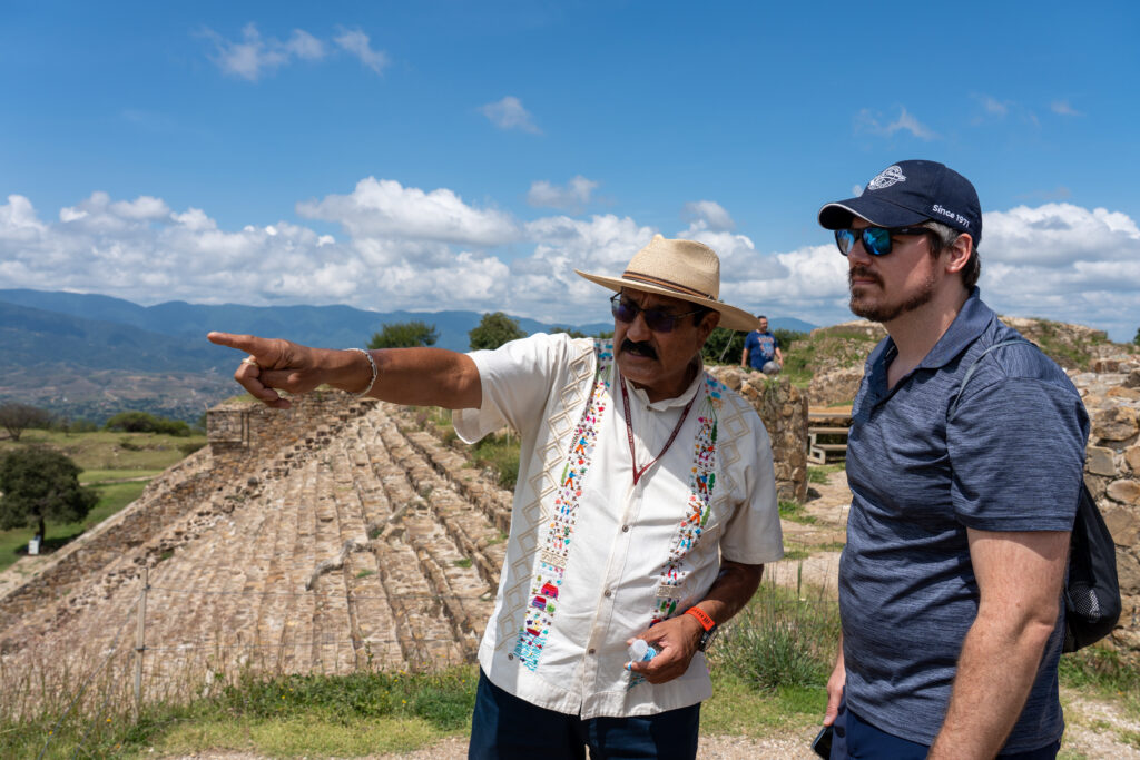 Walking around Zócalo – Mexico City’s main central squareEnjoying the Museum of Anthropology to ourselves with an after-hours visitUp close: an Aztec stone sculptureTaking in the wonders of Teotihuacan – the City of GodsSettling in for an alebrije workshop with a local artisanOur traditional folk-art creaturesBrushes out: we put our painting skills to the testThe beautiful Monte Albán – one of Mesoamerica’s earliest major citiesExploring Monte Albán’s many temples, plazas, and ruinsOur amazing local guides share insights that help us understand what we’re seeingAdmiring Frida Kahlo’s Casa Azul on a private visitFrida Kahlo’s art studio – where masterpieces startedSailing through Xochimilco’s legendary gardens by canal boatFueling up with a farm fresh mealSharing laughs and smiles over authentic cuisineLearning about typical farm life in Xochimilco from a local farmerWe arrive at the St. Regis, Mexico City in the iconic Paseo de la ReformaDiving into Oaxaca’s local flavors with a cooking demoSavoring the dishes we just madeStunning architecture surrounds Oaxaca’s streetsUnderstanding the significance of religion in OaxacaStrolling through the vibrant streets of OaxacaA privately guided visit to the Diego Riviera Museum – crowd-free