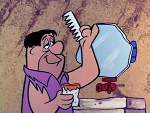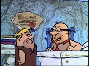 There was Boss For a Day (3/4/66) in which Gazoo allows Fred to experience one day of switching places with Mr. Slate. Of course, Fred finds that being a boss isn’t the easy lot its cracked up to be, and can’t stand up to the pressures, leaving him happy to return to the frustrations of his old job at story’s end. Finally, there was The Long, Long, Long Weekend (1/21/66), in which Fred attempts to adapt to a Jetsons’-style future Bedrock, via magical transportation through time by Gazoo. Some of the changes are unexpected – like teenagers’ dancing crazes having turned full circle, and returned to the waltz, and future television that only runs episodes of Peyrock Place (pun on “Peyton Place”) 24/7, on all channels. But the most personal challenge to Fred is a visit to future Slate Construction, where a descendant of Fred’s boss looks up company records on past employee Fred Flintstone, and discovers that an unrepaid loan of a few dollars received by Fred has, with accumulating interest, escalated to a debt of millions of dollars. Fred barely escapes future Slate’s wrath in seeking repayment from the descendent of the “deadbeat”, and is returned to the Stone Age, where Fred resolves to pay Slate back his loan immediately on Monday.