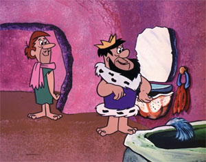 Much in the same vein, and perhaps closer to the literary roots of the classic “doubles” story by Mark Twain, “The Prince and the Pauper”, is King For a Night (12/3/64). Fred’s double is the king of Stonesylvania, in Bedrock with his prime ministers to obtain a loan to his kingdom of ten million dollars. His voice bears a mittel-European mock-accent, but he is identical in looks to Fred except for a luxurious black beard. He too is tired of being cooped up in castles and hotels, and wants to see how the peasants live. A simple shave of his beard, and he is all ready to fly the coop. Again, his prime ministers wish to save their cushy jobs with the loan money, as well as make back payments on the royal yacht and wall-to-wall carpets, so recruit Fred to substitute at the royal ball to collect the money, promising Fred to pay him a cool 3,000. Fred, although missing a bowling match, reacts to the figure with the remark, “Who wants to buy a bowling ball?”